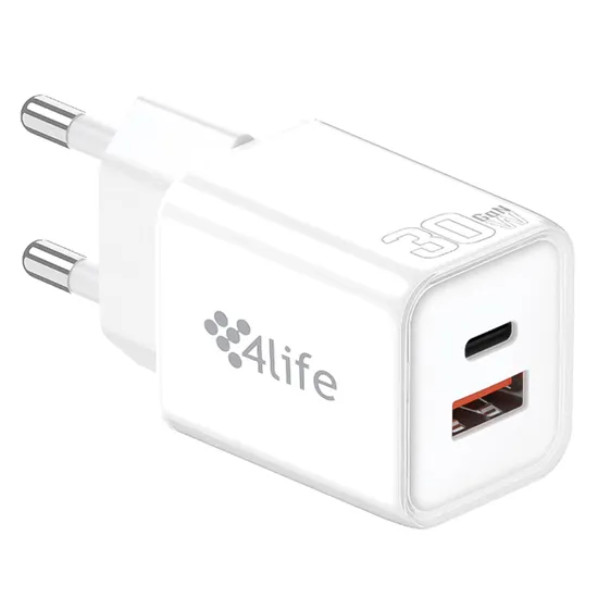 O carregador 4Life FL9530ACGW oferece 30¿W de potência para recarga rápida de celulares, tablets e acessórios. Possui conector USB-C compatível com fast charge, acelerando o carregamento e reduzindo o tempo na tomada. Com duas saídas, USB-A e USB-C, amplia a compatibilidade com diversos cabos e dispositivos. Compacto e prático, é ideal para uso diário, garantindo eficiência e conveniência ao carregar aparelhos em casa, no trabalho ou em viagens.