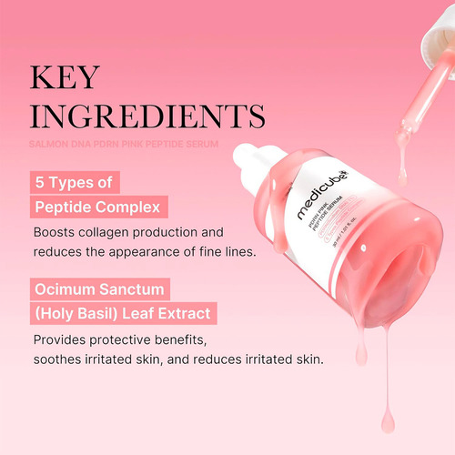 Descubre el poder transformador del PDRN Pink Peptide Serum de Medicube, un sérum facial diseñado para todo tipo de piel. Su fórmula avanzada combina ingredientes como adenosina, niacinamida, PDRN y péptidos, que trabajan en sinergia para proporcionar una hidratación profunda, reafirmar la piel y reducir la apariencia de arrugas.